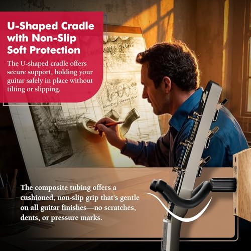 - 𝗨𝗻𝗶𝘃𝗲𝗿𝘀𝗮𝗹 𝗙𝗶𝘁 𝘄𝗶𝘁𝗵 𝗔𝘂𝘁𝗼 𝗣𝗶𝘃𝗼𝘁: ClefArc guitar hanger is designed with an auto pivot yoke to accommodate angled or straight headstocks, ensuring a perfect fit for all your guitars.