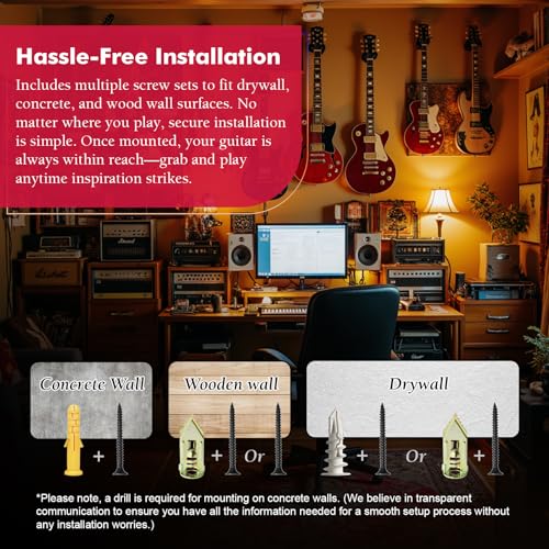 - 𝗘𝗮𝘀𝘆 𝗜𝗻𝘀𝘁𝗮𝗹𝗹𝗮𝘁𝗶𝗼𝗻 𝘄𝗶𝘁𝗵 𝗣𝗶𝗹𝗼𝘁 𝗛𝗼𝗹𝗲 𝗚𝘂𝗶𝗱𝗲: With included anchors, screws, and a pre-drill assistant sticker, this guitar wall mount ensures precise placement on any wall type. Whether installing on drywall, wood, or concrete, the setup is smooth and straightforward, allowing for accurate drilling and a secure fit.